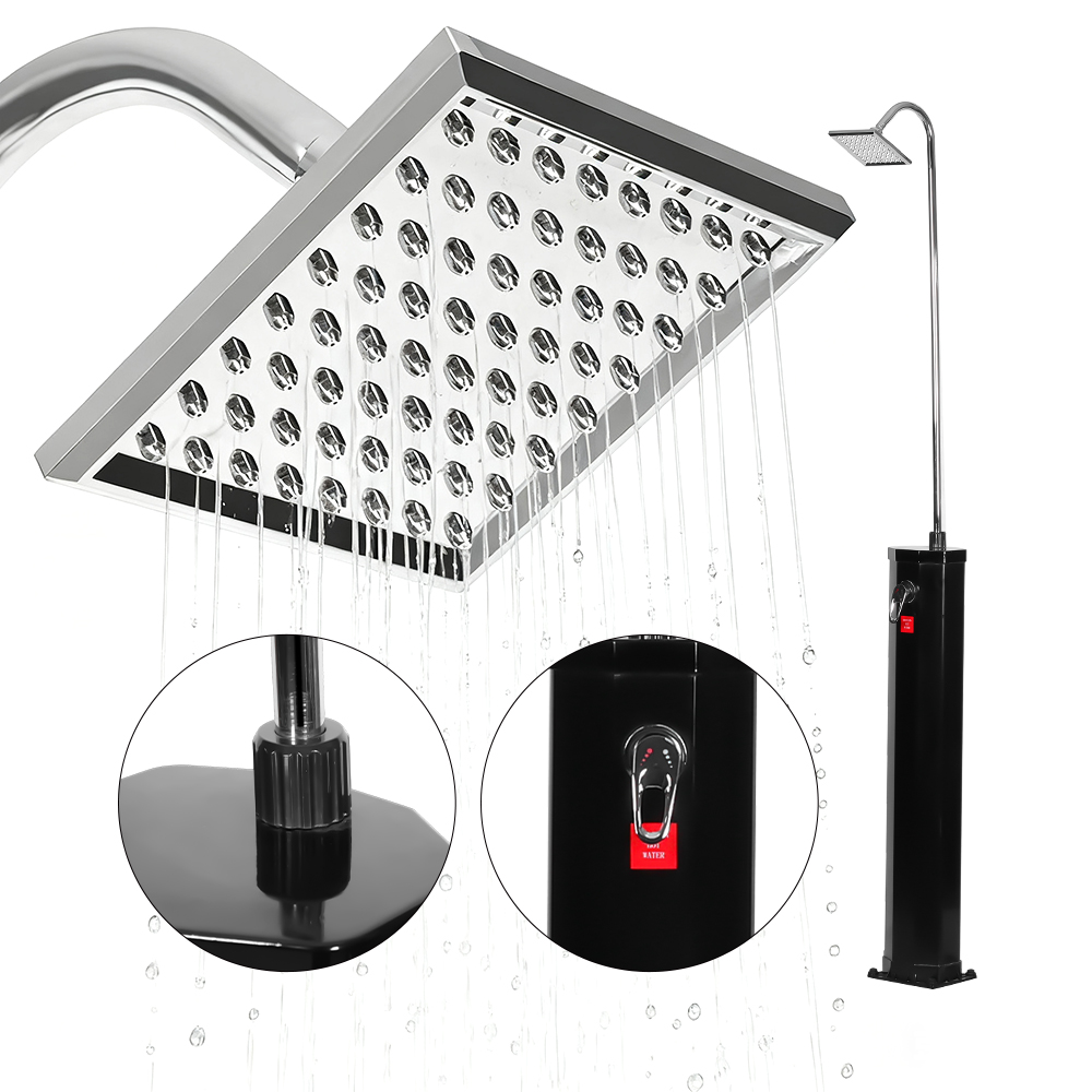Diese UV-beständige quadratische schwarze Outdoor-Solardusche aus PVC LY18L06 mit 18 l Fassungsvermögen für Gartenschwimmbäder kombiniert leichtes Design mit langlebiger Konstruktion und lässt sich daher leicht zerlegen, transportieren und in verschiedenen Außenbereichen aufstellen. Seine robuste Basis aus Edelstahl, PVC, ABS, Kupfer und anderen robusten Materialien bietet überall, wo es platziert wird, zuverlässige Stabilität und gewährleistet eine sichere und komfortable Verwendung. Der große Regenduschkopf bietet vielseitige Funktionalität und kann sich dank seines integrierten Kugelgelenks um 360° drehen, sodass Sie eine optimale Kühlung aus verschiedenen Winkeln genießen können. Für zusätzlichen Komfort ermöglicht ein eingebauter Fußhahn das einfache Abspülen ohne Verwendung der Überkopfdusche.