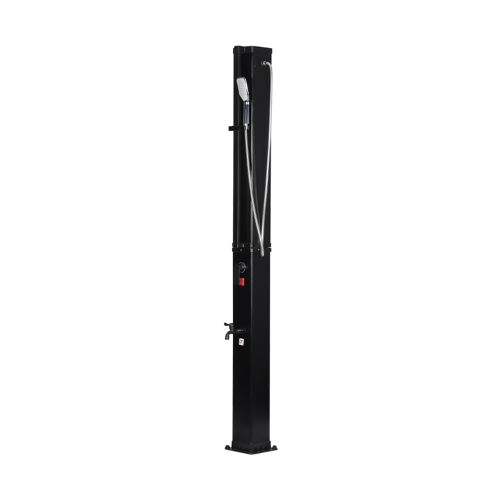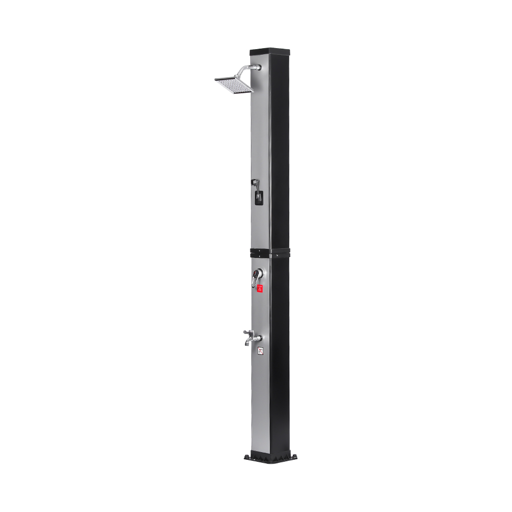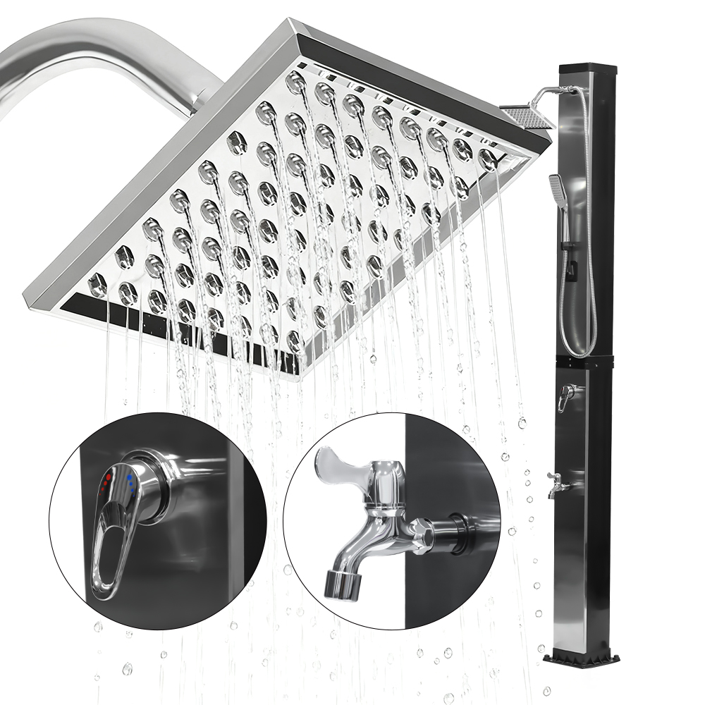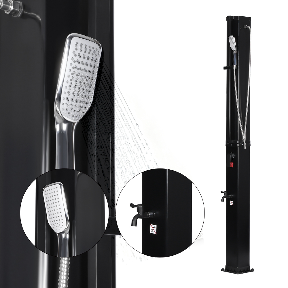 Diese multifunktionale Solardusche LY35L07 mit großer Kapazität nutzt nur Sonnenlicht, um Wasser auf bis zu 60 °C zu erhitzen und bietet so eine energiesparende und umweltfreundliche Möglichkeit, das Baden im Freien zu genießen. Das Befüllen ist einfach —schließen Sie einfach einen Standard-Gartenschlauch an den Einlass und das Duschwasser ist schnell einsatzbereit. Ein eingebautes Metallregal bietet einen praktischen Platz zur Aufbewahrung von Duschgel und anderen wichtigen Dingen, während Abflusslöcher an der Basis dafür sorgen, dass das Wasser effizient abfließt und der Bereich trocken und ordentlich bleibt. Diese Solardusche wurde mit Blick auf Vielseitigkeit entwickelt und eignet sich perfekt für verschiedene Umgebungen, sei es am Strand, am Pool, in einem Ferienhaus, Hotel oder Bungalow. Seine flexible Struktur ermöglicht es ihm, sich an unterschiedliche Umgebungen anzupassen.