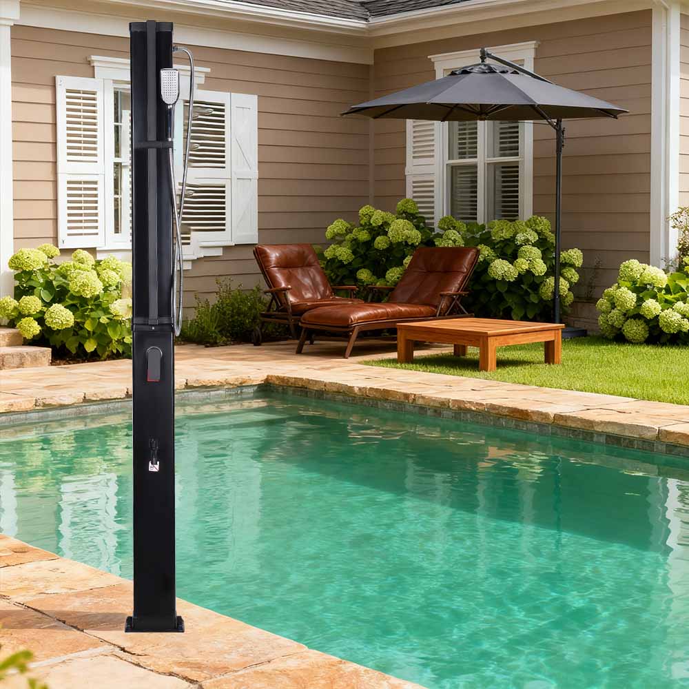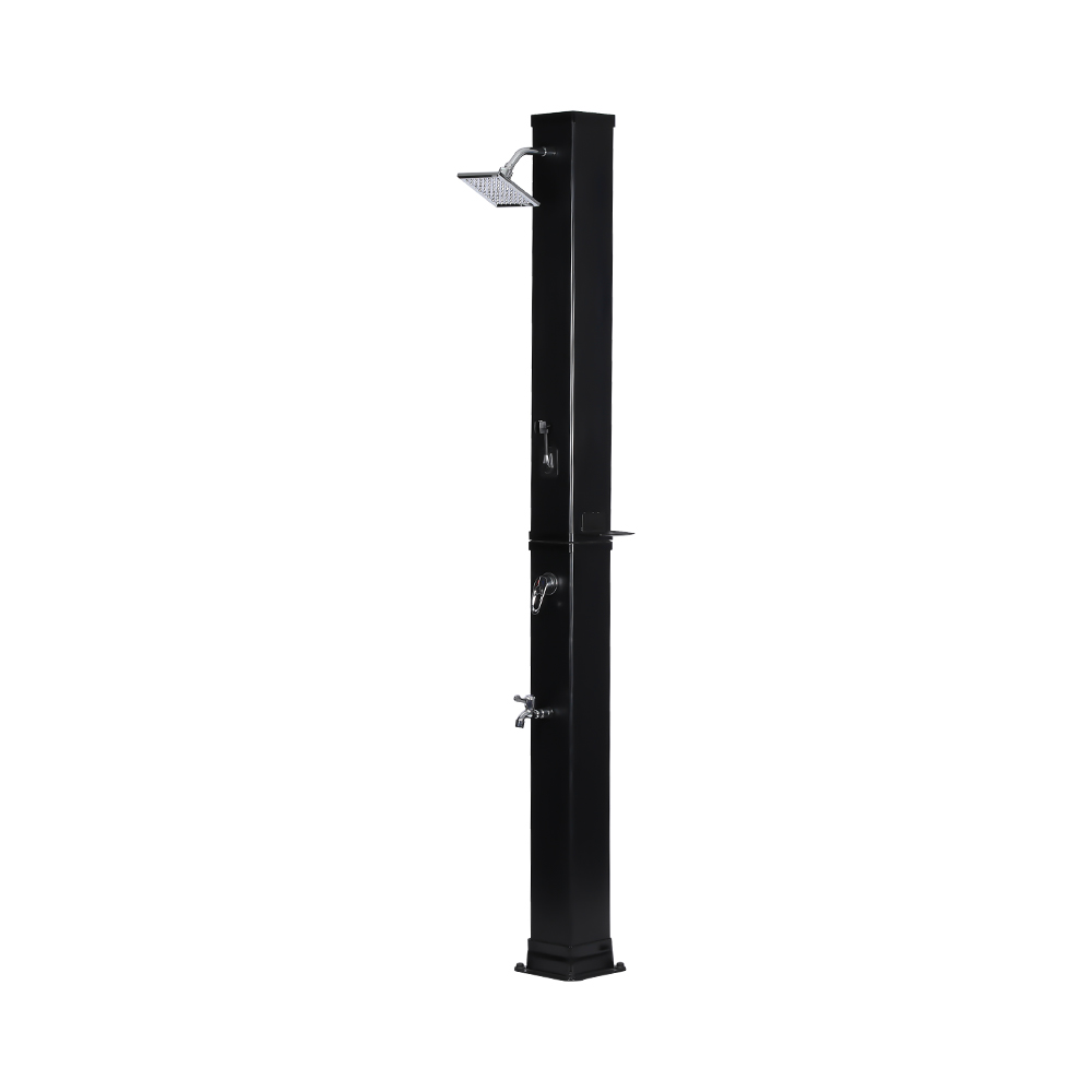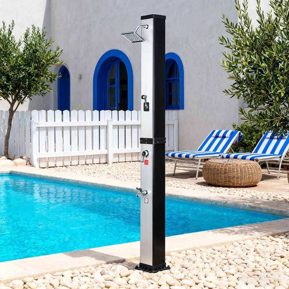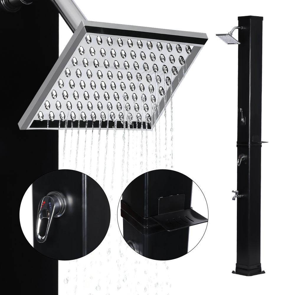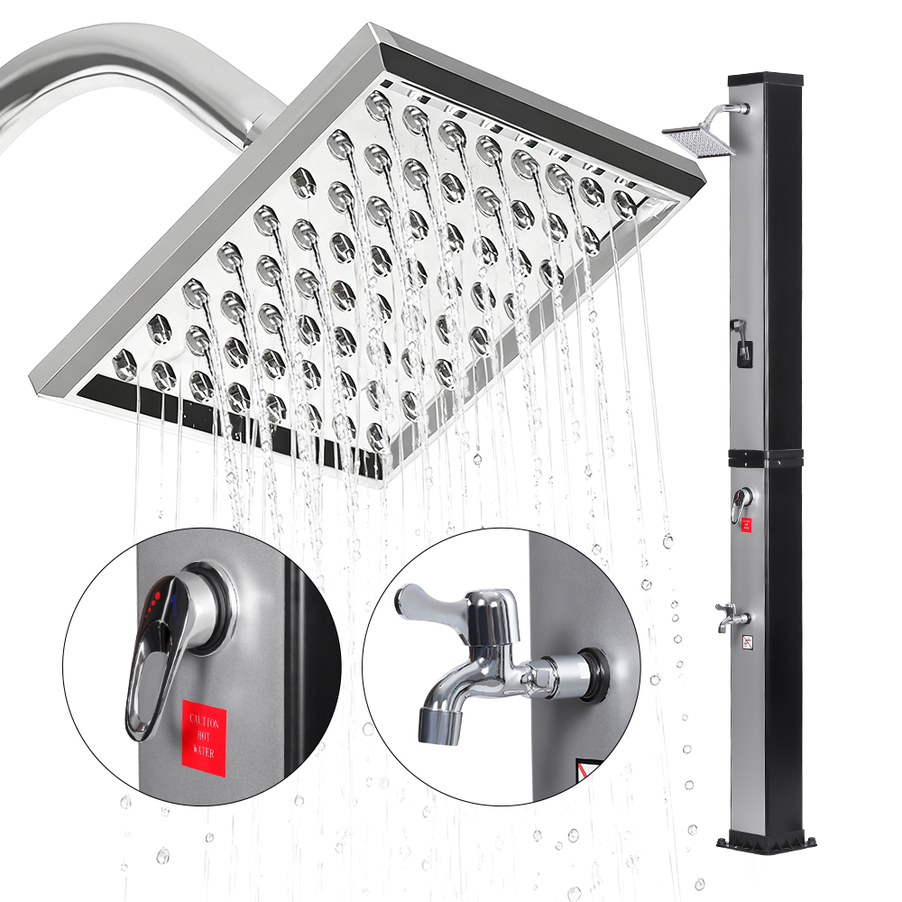 Diese multifunktionale Solardusche LY35L07 mit großer Kapazität nutzt nur Sonnenlicht, um Wasser auf bis zu 60 °C zu erhitzen und bietet so eine energiesparende und umweltfreundliche Möglichkeit, das Baden im Freien zu genießen. Das Befüllen ist einfach —schließen Sie einfach einen Standard-Gartenschlauch an den Einlass und das Duschwasser ist schnell einsatzbereit. Ein eingebautes Metallregal bietet einen praktischen Platz zur Aufbewahrung von Duschgel und anderen wichtigen Dingen, während Abflusslöcher an der Basis dafür sorgen, dass das Wasser effizient abfließt und der Bereich trocken und ordentlich bleibt. Diese Solardusche wurde mit Blick auf Vielseitigkeit entwickelt und eignet sich perfekt für verschiedene Umgebungen, sei es am Strand, am Pool, in einem Ferienhaus, Hotel oder Bungalow. Seine flexible Struktur ermöglicht es ihm, sich an unterschiedliche Umgebungen anzupassen.